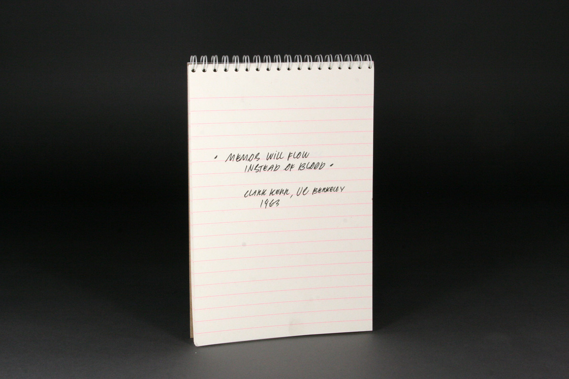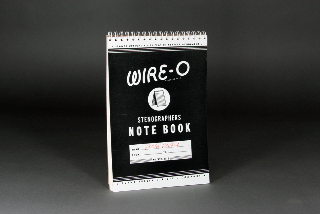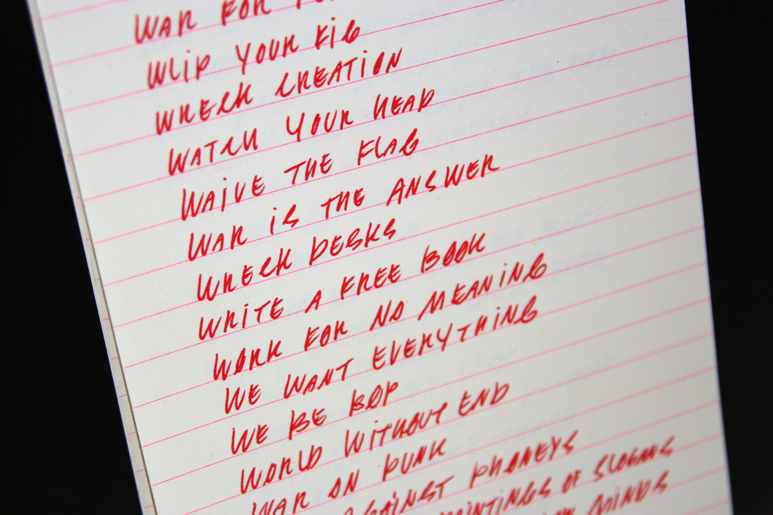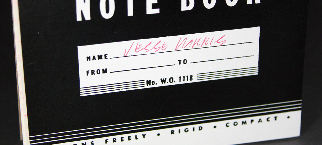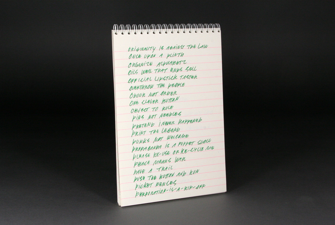 Jesse Harris is a Toronto based artist best known for his witty, wise-cracking slogans frequently presented on buttons. For this artist’s book he has gone back through years worth of his working notebooks and compiled every slogan he has ever thought up and hand-written them alphabetically in a mock steno pad.