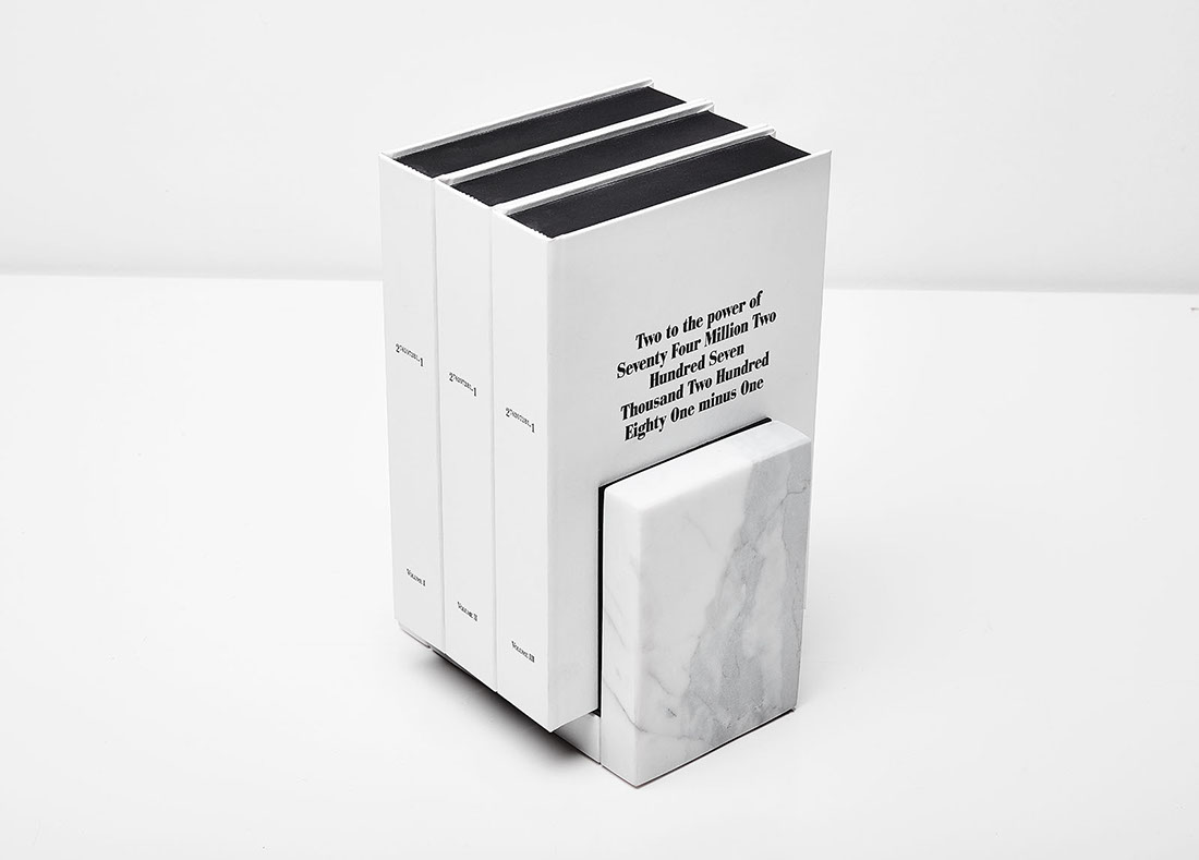 Like the books in Borges’ Library of Babel whose seemingly random letters and punctuation served as building blocks for the basis of language and the universe, the digits within 274207281-1 reveal the universe’s mathematical structure. Everything in the universe–including humans–are part of this structure. All matter is made of particles which have properties of charge and spin; these properties are essentially mathematical. Notwithstanding their apparent simplicity and fundamental character, prime numbers remain one of the most mysterious objects studied by mathematicians. The impossible task of the 274207281-1 books is to present the number in such a way that it may reveal some insight into the nature of Prime Numbers.