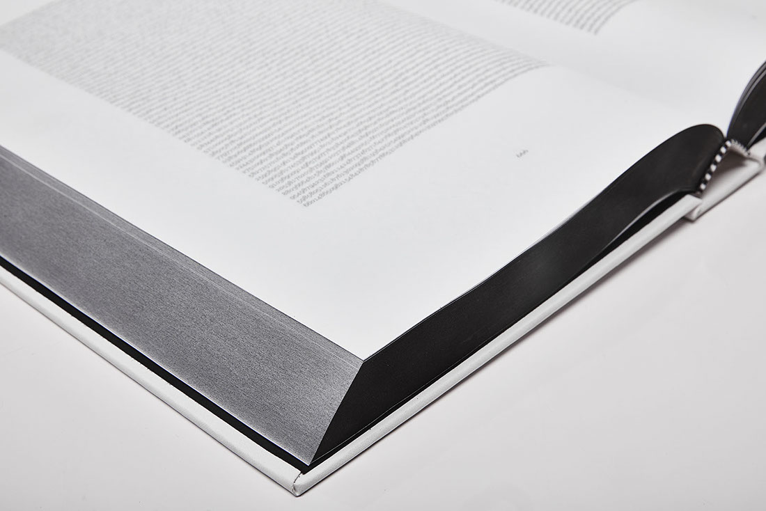 The book is 7” by 10.5”, a ratio that follows the classic harmonic 2 : 3 proportions. The margin proportions follow the common medieval structure of 2 : 3 : 4 : 6. The cases are wrapped in white book cloth and the binding features black edge colouring, black headbands and black endpapers. The covers and spine are printed on a letterpress in black and the colophon is printed on a letterpress in metallic silver on the endpapers. The inside pages were printed on a web inkjet press in black on Bible paper.