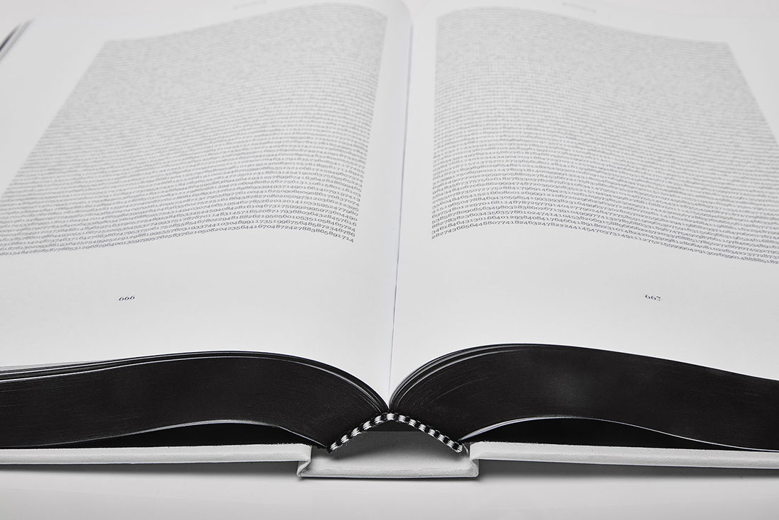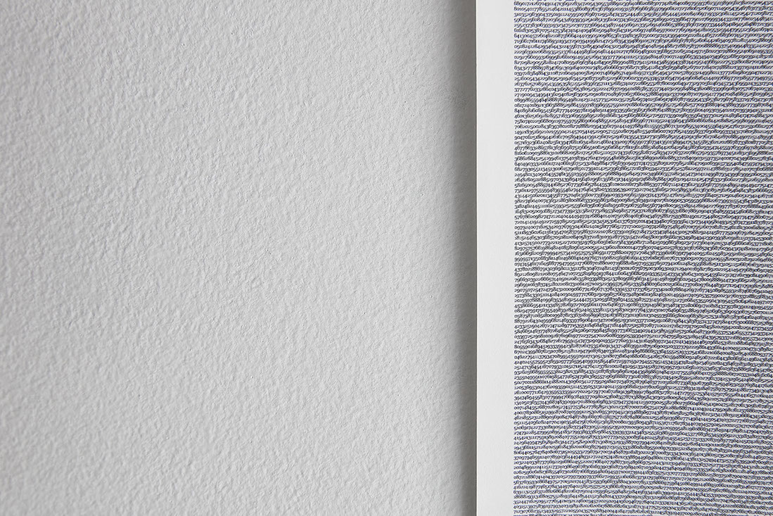 The poster is 36” wide and 50’ long. The number is set in 2.6 point type in Figgins Sans and printed giclée in black on an acid free, 100% cotton rag 340 gsm stock. It comes with a bent metal shelf to hold the poster made of 16 gauge rolled steel and is finished with a white, matte sandtex powder coat. It is printed in a limited edition of eleven.
