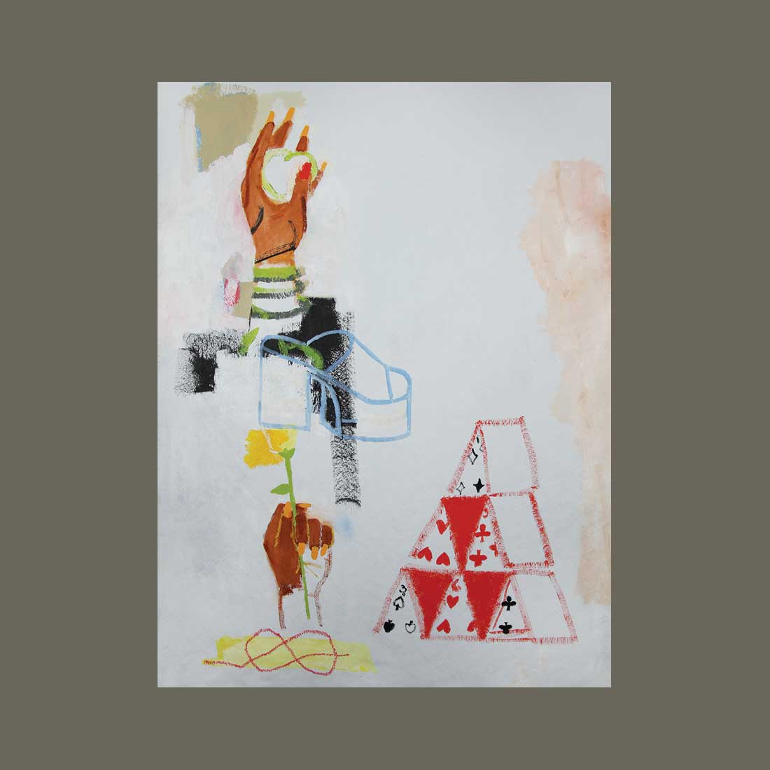 Nadia Gohar’s vivid painting and sculptural work focuses on her attachment to objects–objects she owns; objects she’s seen; objects that she can’t be sure she’s seen, but that linger in her imagination nonetheless. A natural forager, she is an expert at amassing things that act as considered inspiration: trinkets from Chinatown, fruit wrappers, houseplants. Raised in Cairo but currently based in Toronto, her colourful but soft aesthetic often reflects her surroundings while encapsulating her nostalgia for the past and her entire history. Nothing is forgotten. All has meaning. The green sandal on her studio floor remains forever treasured through its depiction, just above, oil paint on a piece of unstretched canvas.