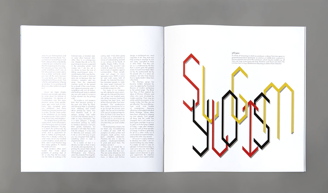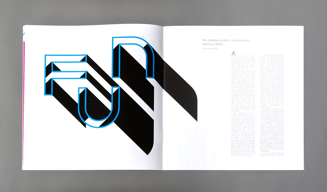 Alex Durlak presents the latest version of The Amateur Printer, an on-going series of printed matter inspired by an essay of the same name from 1949 by Peter Beilenson, the printer, designer, and founder of Peter Pauper Press. The essay is a call to action for commercial book printers to take a break from the daily grind of running a business and to pick a text they love and print a book of it from scratch. The intent of such an act is to both rediscover the joy of printing in of itself and to have a playground for progressive experimentation over revisionism in design. This book is Durlak's most recent answer to that challenge.